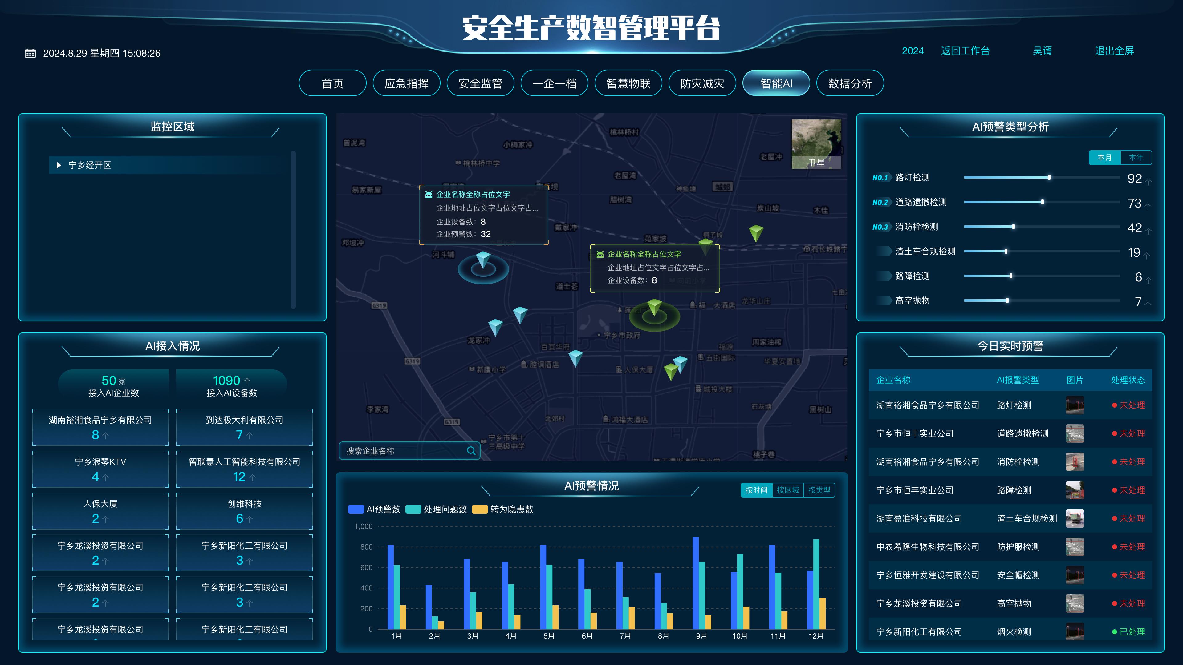 通過“智能AI”數據看板,隨時查看轄區內各企業每日警情,AI預警情況,針對預警類型進行智能統計分析,直觀展示每月每年高頻違規類型和數量。