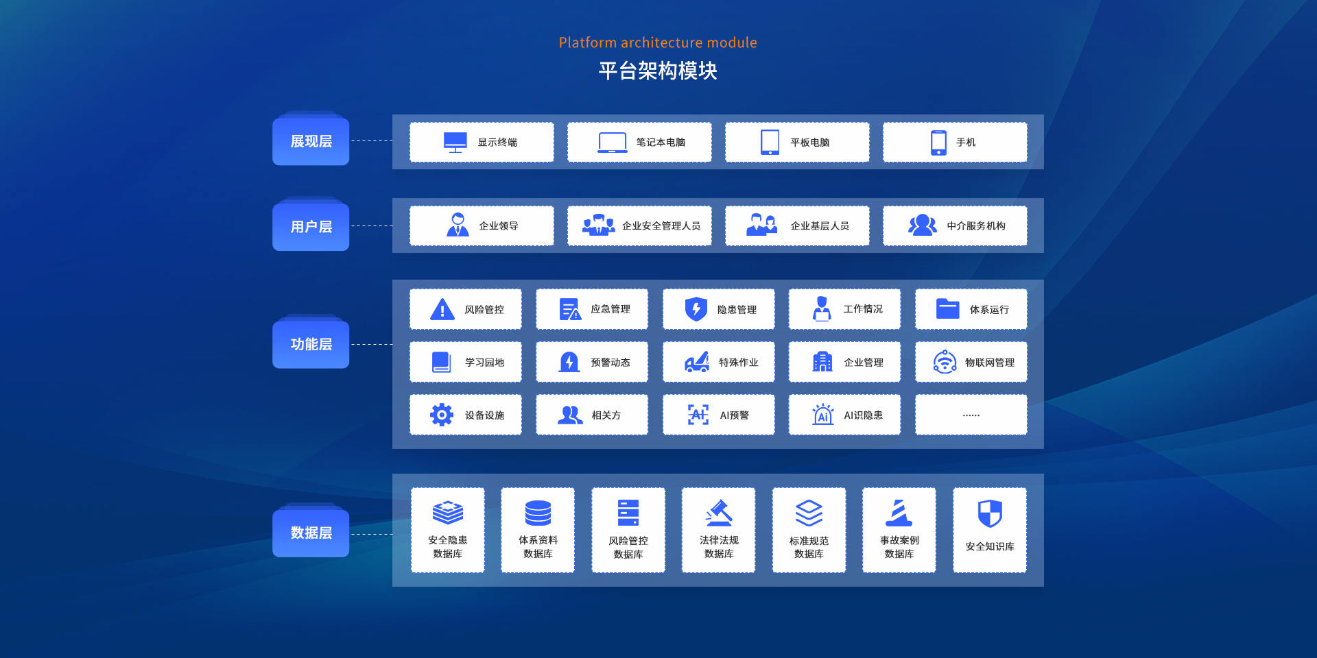企業數智化安全管理平臺(俗稱企業端)匯集企業管理、風險管控、隱患管理、體系運行、危險作業、AI預警、AI識隱患、應急管理、預警動態、一會三卡、物聯網管理、相關方、設備設施、學習園地等功能于一體,旨在構建標準化、規范化、便捷化的管理流程,引導企業自主開展安全管理工作,建立健全全員安全生產責任制,全面提升企業安全管理數智化水平。