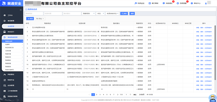 企業安全管理人員可依托檢查表庫、隱患數據庫或者自主新增,完成隱患的排查、上報、整改、復查、歸檔等一系列流程運轉,實現隱患閉環管理;根據隱患排查治理信息,自動生成安全檢查報告,支持線上打印及一鍵導出。