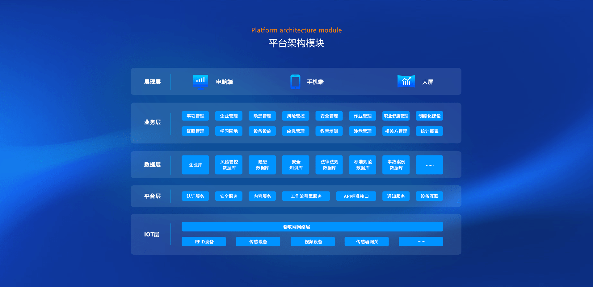 該平臺基于國家安全生產(chǎn)法律法規(guī)要求及國內(nèi)外安全管理的先進經(jīng)驗,從系統(tǒng)安全管理的角度出發(fā),利用互聯(lián)網(wǎng)、物聯(lián)網(wǎng)、大數(shù)據(jù)應(yīng)用技術(shù),旨在打造全方位的安全管理體系。通過標準化業(yè)務(wù)模塊、全面風(fēng)險管控機制、職責(zé)統(tǒng)一的業(yè)務(wù)流,專業(yè)化的安全數(shù)據(jù)支撐、可視化的數(shù)據(jù)呈現(xiàn),提升安全管理效能,實現(xiàn)企業(yè)安全生產(chǎn)主體責(zé)任落實到位、全員全過程參與安全管理,建立企業(yè)安全生產(chǎn)長效機制,構(gòu)建安全管理健康有序發(fā)展的良性格局。