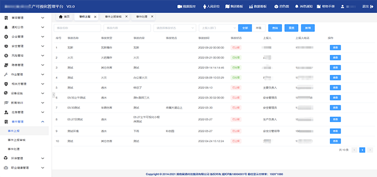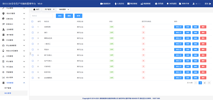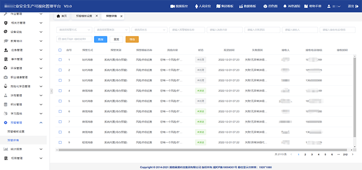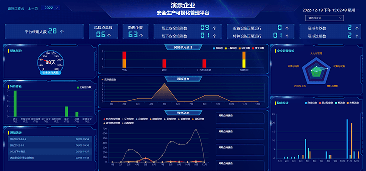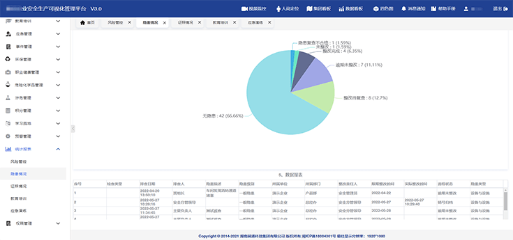 可實現(xiàn)風(fēng)險管控、隱患情況、教育培訓(xùn)、證照管理、應(yīng)急演練等不同維度數(shù)據(jù)統(tǒng)計分析,智能生成數(shù)據(jù)報表,為,為決策層制定安全目標和方針提供精準的數(shù)據(jù)支撐。