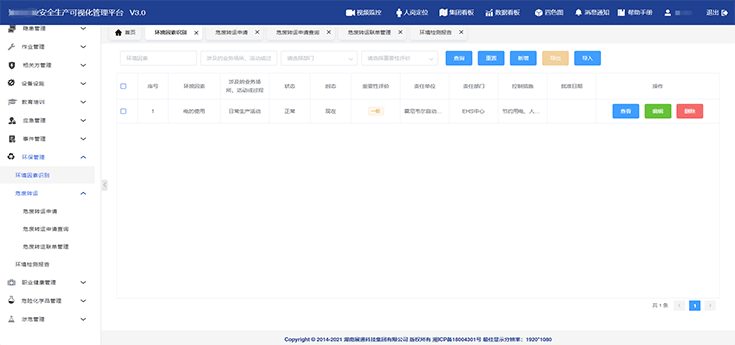 環(huán)境因素識別:可實現(xiàn)可環(huán)境因素的狀態(tài)、時態(tài)、環(huán)境影響、控制措施的實時把控,形成環(huán)境因素識別清單;