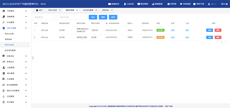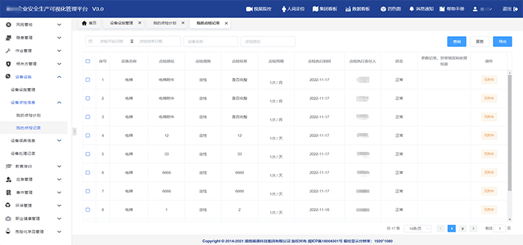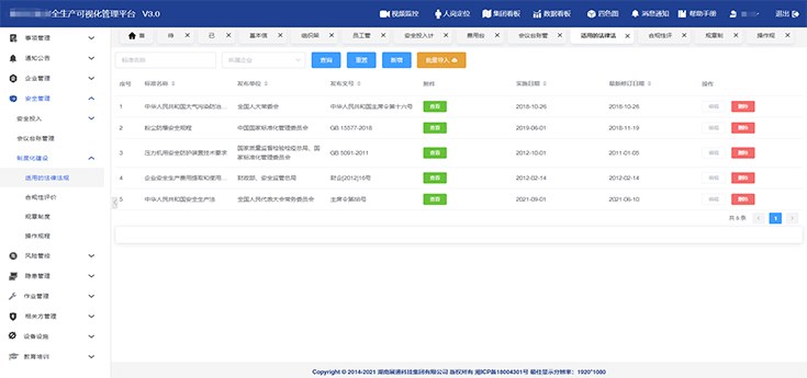 構(gòu)建安全投入(計劃及費用)、各類安全會議、制度化建設(shè)(法律法規(guī)、合規(guī)性評價、規(guī)章制度、操作規(guī)程等)模塊內(nèi)容的臺賬,便于實時查詢與調(diào)取。