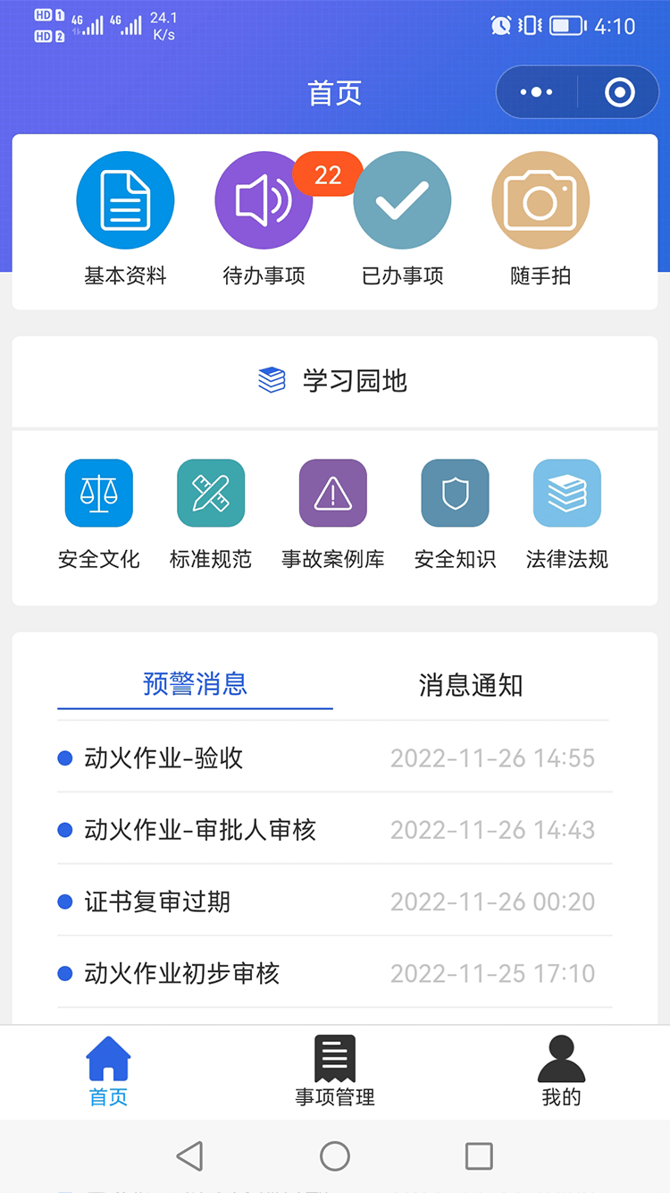 配置相應(yīng)預(yù)警規(guī)則,可實現(xiàn)隱患整改/復(fù)查、隨手拍審核、風(fēng)險巡查、證照審核、證件預(yù)過期、特殊作業(yè)流程審批、演練計劃、應(yīng)急值守等各類工作事項預(yù)警,及時推送至相關(guān)負責(zé)人,提醒其進行工作處理。